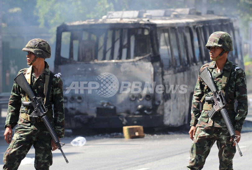 AFP特派員によると、タクシン派のデモ隊はバンコクの国連(UN)ビル近くで占領したバス7台にも火をつけ、空高く炎が燃えあがった。(c)AFP