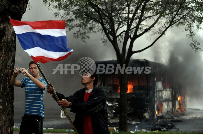 AFP特派員によると、タクシン派のデモ隊はバンコクの国連(UN)ビル近くで占領したバス7台にも火をつけ、空高く炎が燃えあがった。(c)AFP