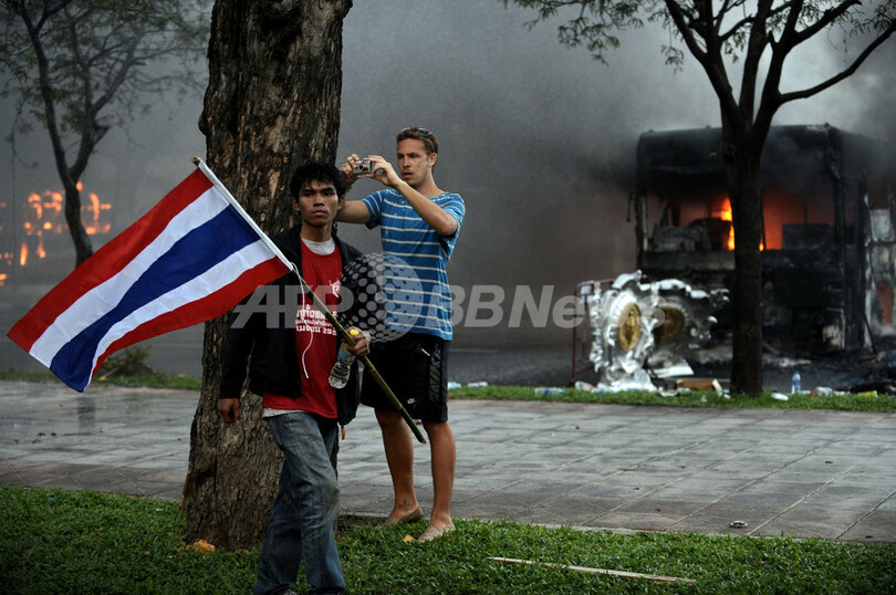 AFP特派員によると、タクシン派のデモ隊はバンコクの国連(UN)ビル近くで占領したバス7台にも火をつけ、空高く炎が燃えあがった。(c)AFP