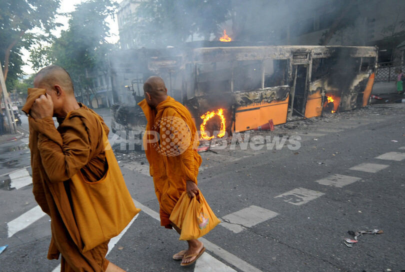 AFP特派員によると、タクシン派のデモ隊はバンコクの国連(UN)ビル近くで占領したバス7台にも火をつけ、空高く炎が燃えあがった。(c)AFP