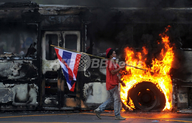 AFP特派員によると、タクシン派のデモ隊はバンコクの国連(UN)ビル近くで占領したバス7台にも火をつけ、空高く炎が燃えあがった。(c)AFP