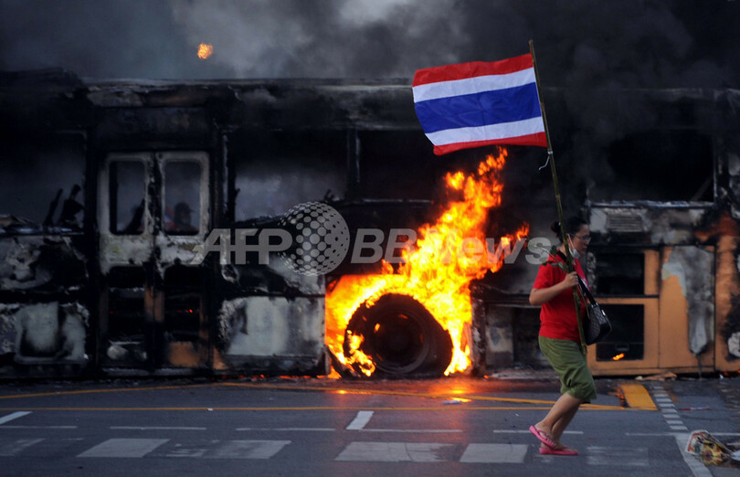 AFP特派員によると、タクシン派のデモ隊はバンコクの国連(UN)ビル近くで占領したバス7台にも火をつけ、空高く炎が燃えあがった。(c)AFP