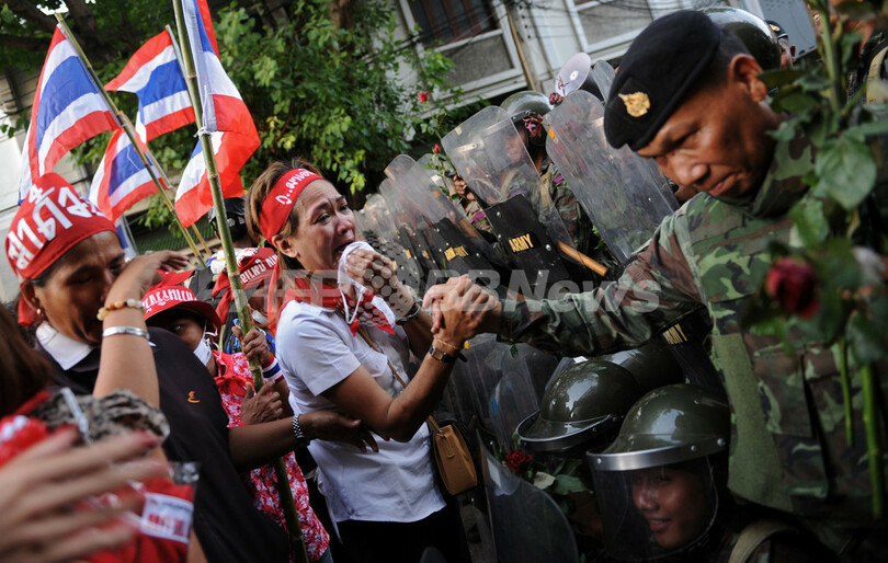 【4月13日 AFP】(写真追加)タイの首都バンコク(Bangkok)で政府に抗議を続けているタクシン・シナワット(Thaksin Shinawatra)元首相派のデモは13日も激化し、火炎瓶を投げ込まれた教育省の関連庁舎1棟が炎上した。