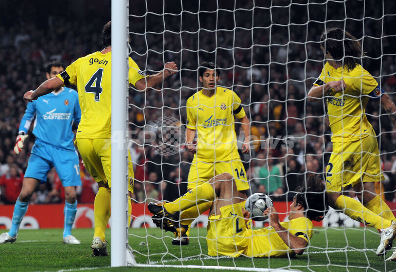 その後、アーセナルはロビン・ファン・ペルシー(Robin Van Persie)がペナルティーキック(PK)を沈めて勝利を決定付けた。一方、ビジャレアルは、PKの判定に抗議し、2枚目のイエローカードを受けてセバスティアン・エグレン(Sebastian Eguren)が退場となり、状況を悪化させた。(c)AFP/Steve Griffiths