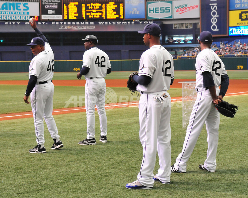 米大リーグ(MLB)で15日、アフリカ系米国人初の大リーガーとして活躍した故ジャッキー・ロビンソン(%%Jackie Robinson%%)氏の栄誉をたたえるジャッキー・ロビンソンデーを迎え、全試合で全選手、全コーチ陣、全審判員が同氏の永久欠番である背番号「42」を着用して試合に臨んだ。写真はニューヨーク・ヤンキース(%%New York Yankees%%)戦に臨むタンパベイ・レイズ(%%Tampa Bay Rays%%)の選手。(2009年4月15日撮影)(c)AFP/Getty Images/Al Messerschmidt