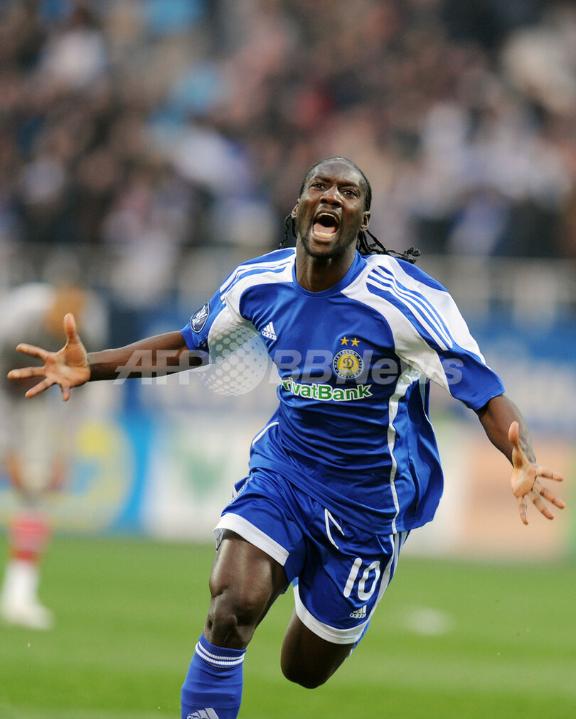 サッカーUEFA杯2008-09(%%UEFA Cup 2008-09%%)準々決勝、ディナモ・キエフ(%%Dynamo Kiev%%)対パリ・サンジェルマン(%%Paris Saint-Germain%%)第2戦。試合はディナモ・キエフが3-0で勝利し、2試合合計スコアを3-0として準決勝へ進出した。写真は前半4分に先制点を決め歓喜するディナモ・キエフのイスマエル・バングラ(%%Ismael Bangoura%%)。(2009年4月16日撮影)(c)AFP/SERGEI SUPINSKY