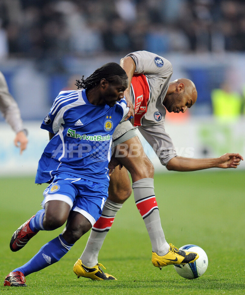 サッカーUEFA杯2008-09(%%UEFA Cup 2008-09%%)準々決勝、ディナモ・キエフ(%%Dynamo Kiev%%)対パリ・サンジェルマン(%%Paris Saint-Germain%%)第2戦。試合はディナモ・キエフが3-0で勝利し、2試合合計スコアを3-0として準決勝へ進出した。写真はパリ・サンジェルマンのサミ・トラオレ(%%Sammy Traore%%、右)とボールを競るディナモ・キエフのイスマエル・バングラ(%%Ismael Bangoura%%)。(2009年4月16日撮影)(c)AFP/SERGEI SUPINSKY