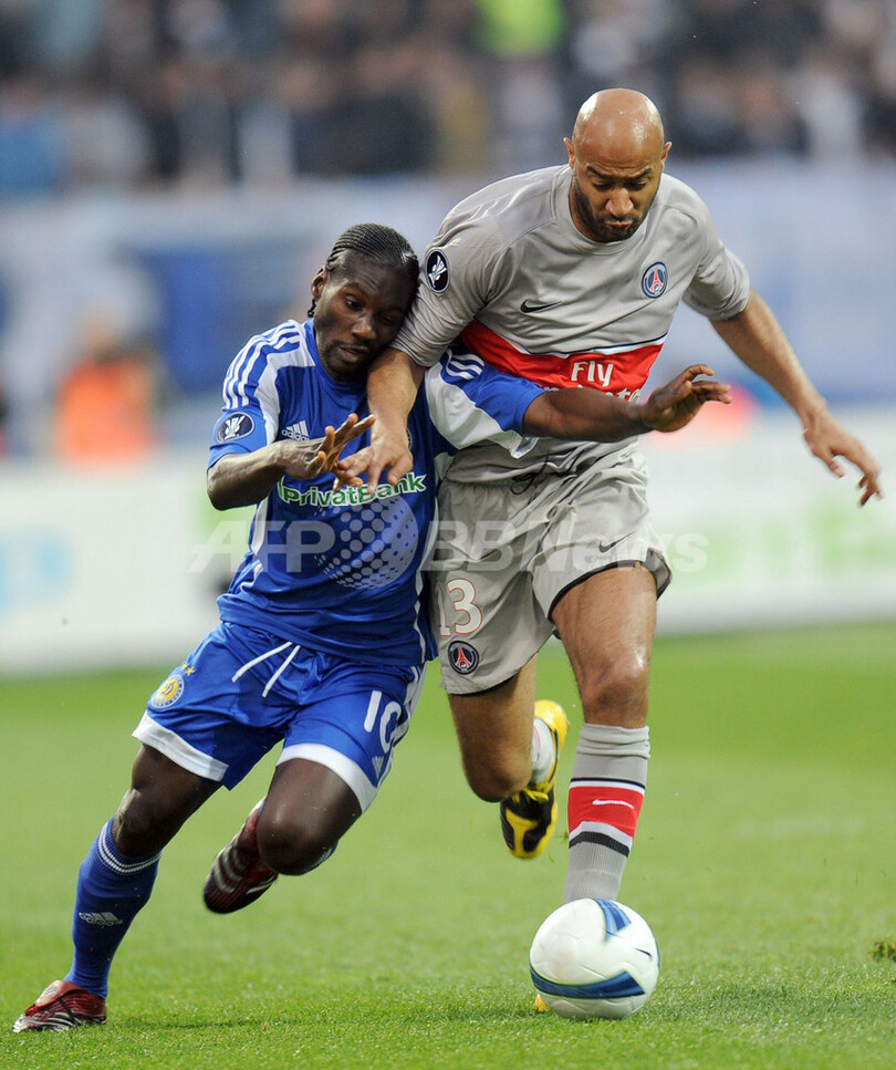 サッカーUEFA杯2008-09(%%UEFA Cup 2008-09%%)準々決勝、ディナモ・キエフ(%%Dynamo Kiev%%)対パリ・サンジェルマン(%%Paris Saint-Germain%%)第2戦。試合はディナモ・キエフが3-0で勝利し、2試合合計スコアを3-0として準決勝へ進出した。写真はパリ・サンジェルマンのサミ・トラオレ(%%Sammy Traore%%、右)とボールを競るディナモ・キエフのイスマエル・バングラ(%%Ismael Bangoura%%)。(2009年4月16日撮影)(c)AFP/SERGEI SUPINSKY