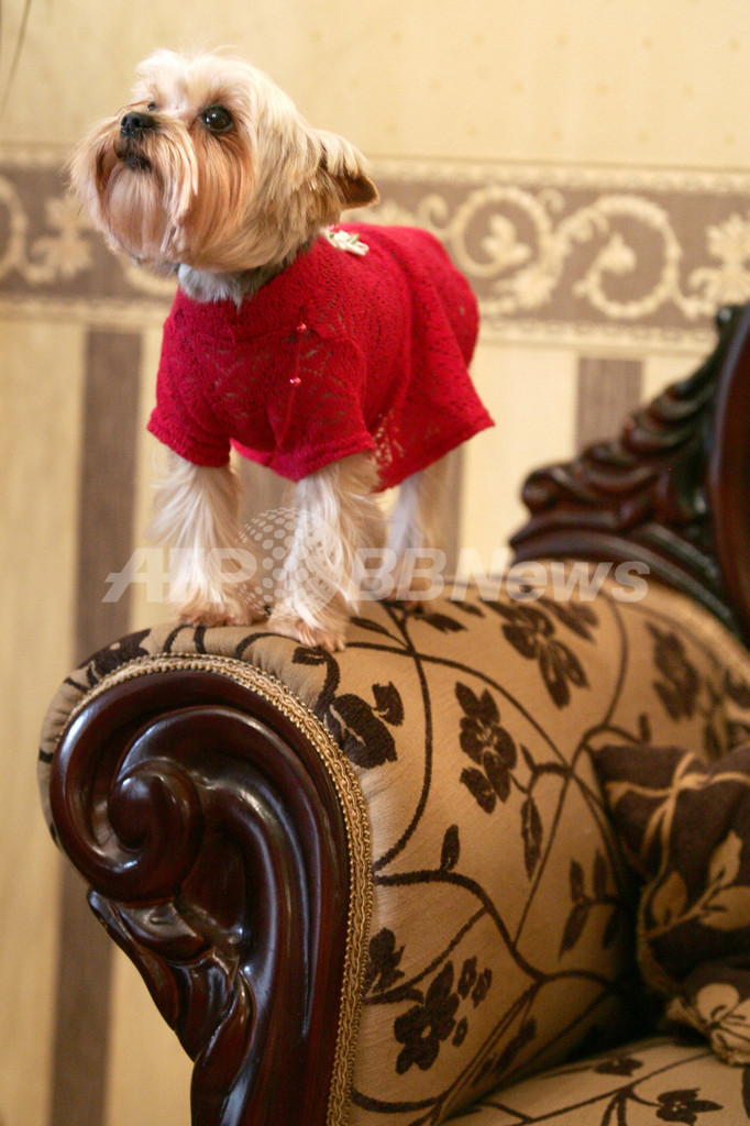 【4月17日 AFP】ロシア・モスクワ(Moscow)にあるペット犬のトリミングサロン「Charly」で、ロシア人デザイナーのスベトラーナ・アブラモワ(Svetlana Abramova)さんの「ベリー・スタイリッシュ・ドッグ(Very Stylish Dog)」ブランドの帽子とマフラーでおしゃれをしたモデル犬。経済危機にもかかわらず、ロシアのペット愛好家が4本足の友だちのファッションにかける意気込みは変わらないようだ。(c)AFP