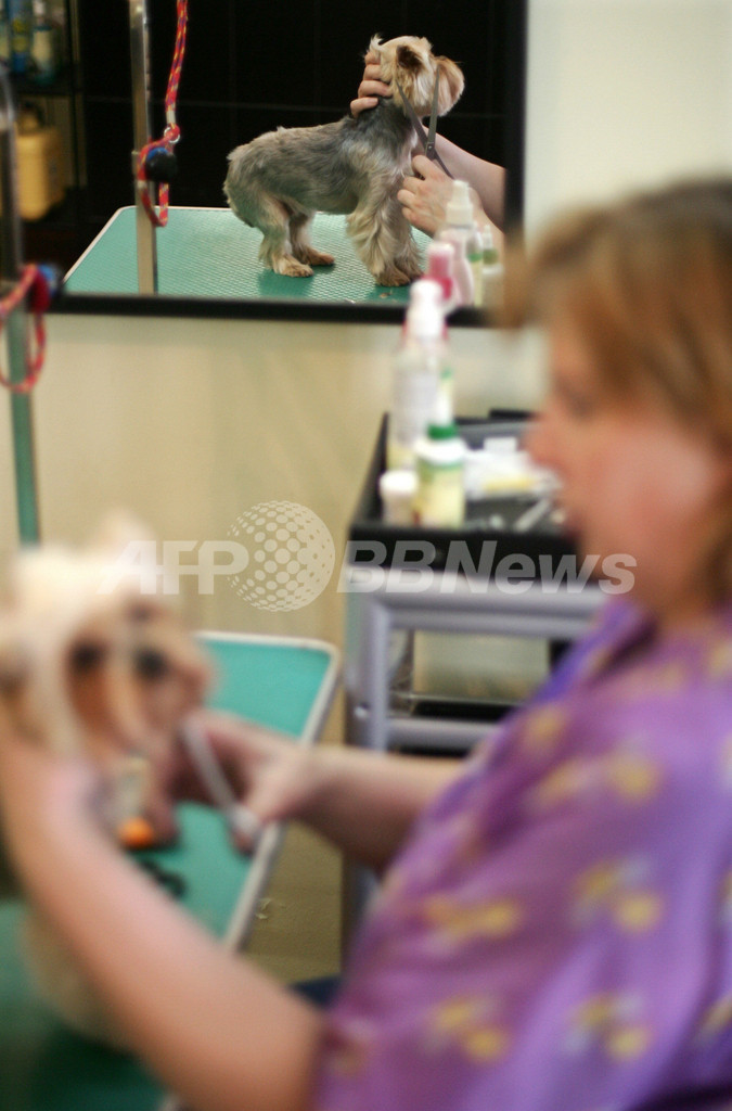 経済危機にもかかわらず、ロシアのペット愛好家が4本足の友だちのファッションにかける意気込みは変わらないようだ(2009年3月18日撮影)。(c)AFP/DMITRY KOSTYUKOV