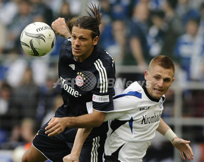 08-09ドイツ・ブンデスリーガ1部第28節、アルミニア・ビーレフェルト(%%Arminia Bielefeld%%)対バイエルン・ミュンヘン(%%Bayern Munich%%)。試合はバイエルンが1-0でビーレフェルトを下した。写真はボールを競るアルミニア・ビーレフェルトのアルトゥル・ヴィフニャレク(%%Artur Wichniarek%%、右)とバイエルン・ミュンヘンのマルティン・デミチェリス(%%Martin Demichelis%%、左)。(2009年4月18日撮影)(c)AFP/DDP/PHILIPP GUELLAND