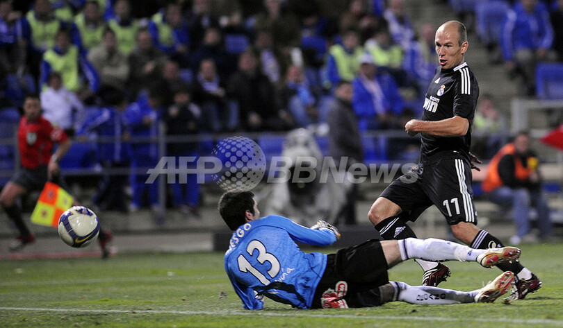 08-09スペイン1部リーグ第31節、レクレアティボ(%%Recreativo Huelva%%)対レアル・マドリード(%%Real Madrid%%)。試合は後半3分にマルセロ(%%Marcelo Vieira Da Silva Junior%%)がゴールを決め、レアル・マドリードが1-0で勝利した。同日行われた試合で首位のFCバルセロナ(%%FC Barcelona%%)が勝利したため、2位レアル・マドリードとバルセロナの勝ち点差は6のまま。写真はレクレアティボのアシエル・リエスゴ(%%Asier Riesgo Unamuno%%)の前でゴールを狙うレアル・マドリードのアリエン・ロッベン(%%Arjen Robben%%、右)。(c)AFP/CRISTINA QUICLER