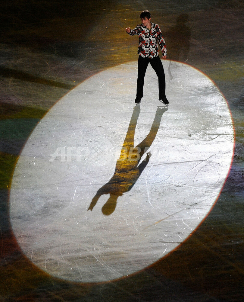 【4月19日 AFP】(写真追加)フィギュアスケート世界国別対抗戦(ISU World Team Trophy 2009)のエキシビションが19日、東京・国立代々木競技場で行われ、日本の安藤美姫(Miki Ando)や浅田真央(Mao Asada)が、ゲストとして登場した米パフォーマンス集団ブルーマングループ(Blue Man Group)とともにパフォーマンスした。(c)AFP/TORU YAMANAKA