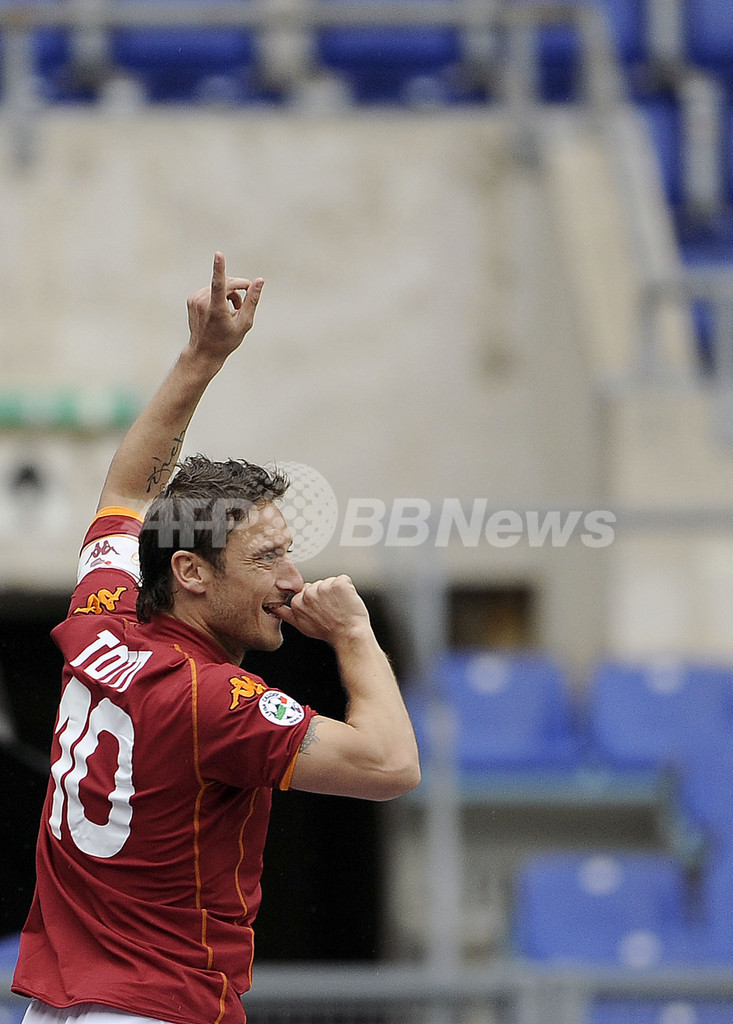 ASローマのフランチェスコ・トッティ(Francesco Totti)が、この試合で2得点を記録し、リーグ通算得点数を175に伸ばし、1940年代にASローマで活躍したアメデオ・アマデイ(Amedeo Amadei)氏の記録(通算174得点)を抜いて歴代10位に入った。(c)AFP