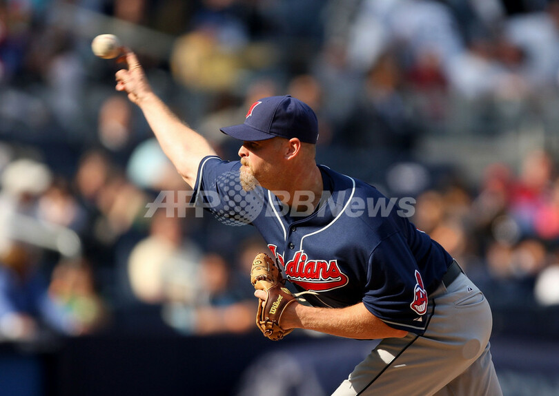 09MLB、ニューヨーク・ヤンキース(%%New York Yankees%%)対クリーブランド・インディアンス(%%Cleveland Indians%%)。試合はヤンキースが7-3でインディアンスを下した。写真は8回途中から5番手で登板し、打者1人を抑えたインディアンスのケリー・ウッド(%%Kerry Wood%%)。(2009年4月19日撮影)(c)AFP/Getty Images/Ezra Shaw