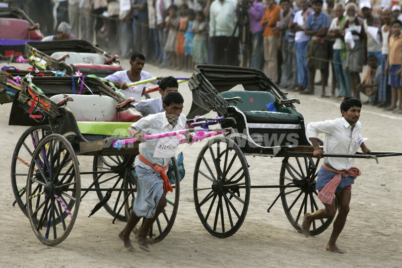 【4月20日 AFP】インド西ベンガル(West Bengal)州コルカタ(Kolkata)で19日、人力車(リキシャ)レースが開催され、普段は市民らを乗せて走る車夫ら100人が参加し、熱戦を展開した。