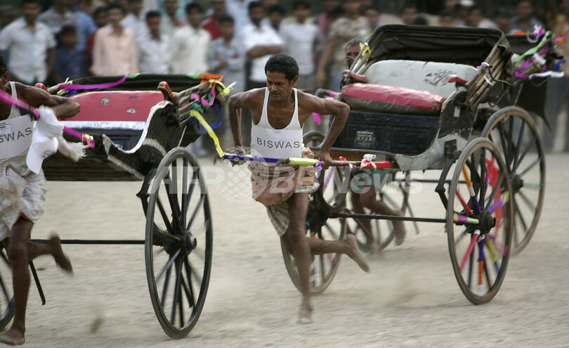 【4月20日 AFP】インド西ベンガル(West Bengal)州コルカタ(Kolkata)で19日、人力車(リキシャ)レースが開催され、普段は市民らを乗せて走る車夫ら100人が参加し、熱戦を展開した。