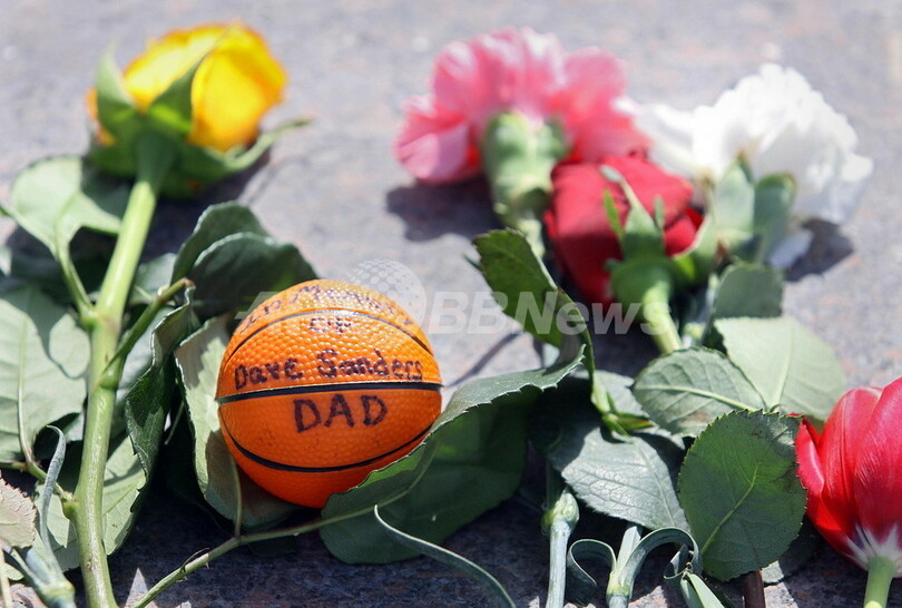 1999年4月20日に米コロラド(Colorado)州リトルトン(Littleton)のコロンバイン高校(Columbine High School)で、2人の生徒が銃を乱射し、生徒12人と教師1人を殺害、23人を負傷させた上、自分たちも自殺した事件から20日で10年が経ち、犠牲者の記念公園、コロンバイン・メモリアル・パーク(Columbine Memorial Park)では追悼式典が行われた。写真はバスケットボールの監督でもあった教師、デーブ・サンダース(Dave Sanders)さんの石碑に捧げられた花とボール(2009年4月20日撮影)。(c)AFP/Getty Images/Marc Piscotty