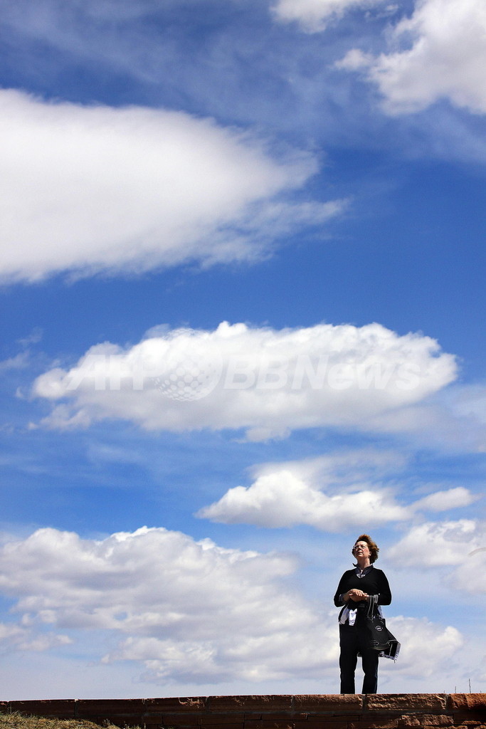1999年4月20日に米コロラド(Colorado)州リトルトン(Littleton)のコロンバイン高校(Columbine High School)で、2人の生徒が銃を乱射し、生徒12人と教師1人を殺害、23人を負傷させた上、自分たちも自殺した事件から20日で10年が経ち、犠牲者の記念公園、コロンバイン・メモリアル・パーク(Columbine Memorial Park)では追悼式典が行われた。写真は同州ハイランズ・ランチ(Highlands Ranch)から訪れた女性。車で公園に向かう途中、雲の合間に1人の天使が見えたと語った(2009年4月20日撮影)。(c)AFP/Getty Images/Marc Piscotty
