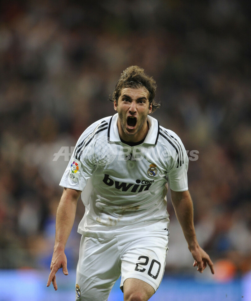 ペペ(Pepe)が退場処分を受けて10人になったレアル・マドリードは、後半ロスタイムにゴンサロ・イグアイン(Gonzalo Higuain)が決勝点を挙げ、本拠地サンチャゴ・ベルナベウ(Santiago Bernabeu Stadium)でのシーソーゲームを制した。(c)AFP/Phil Seery