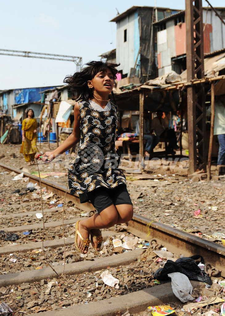 インド・ムンバイ(Mumbai)のスラムBehrampadaで友達と遊ぶ、映画『スラムドッグ$ミリオネア(Slumdog Millionaire)』の出演子役、ルビーナ・アリ・クレシ(Rubina Ali Qureshi)さん(2009年4月21日撮影)。(c)AFP/Sajjad HUSSAIN