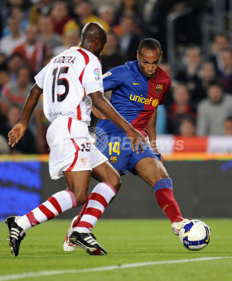【4月23日 AFP】(写真追加、記事更新)08-09スペイン1部リーグ第32節、FCバルセロナ(FC Barcelona)対セビージャFC(Sevilla FC)。試合はバルセロナが4-0でセビージャに快勝し、2位レアル・マドリード(Real Madrid)との勝ち点差を再び6とした。