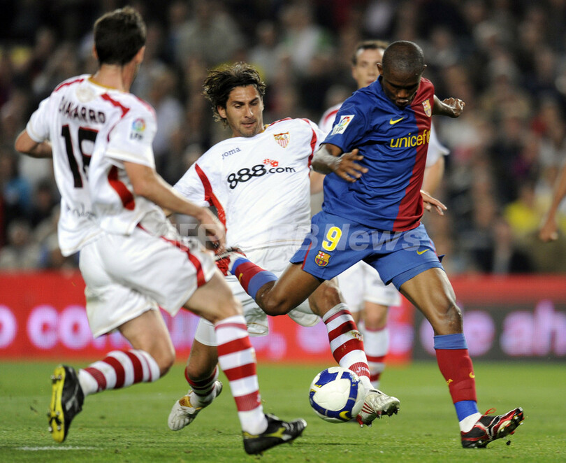 【4月23日 AFP】(写真追加、記事更新)08-09スペイン1部リーグ第32節、FCバルセロナ(FC Barcelona)対セビージャFC(Sevilla FC)。試合はバルセロナが4-0でセビージャに快勝し、2位レアル・マドリード(Real Madrid)との勝ち点差を再び6とした。