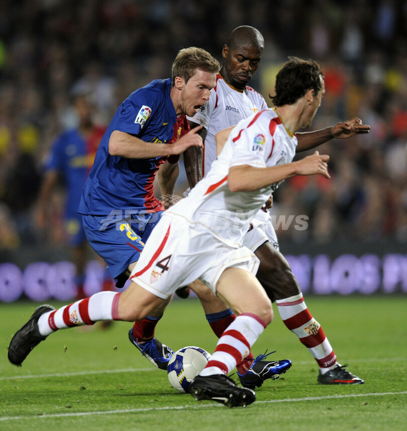 【4月23日 AFP】(写真追加、記事更新)08-09スペイン1部リーグ第32節、FCバルセロナ(FC Barcelona)対セビージャFC(Sevilla FC)。試合はバルセロナが4-0でセビージャに快勝し、2位レアル・マドリード(Real Madrid)との勝ち点差を再び6とした。