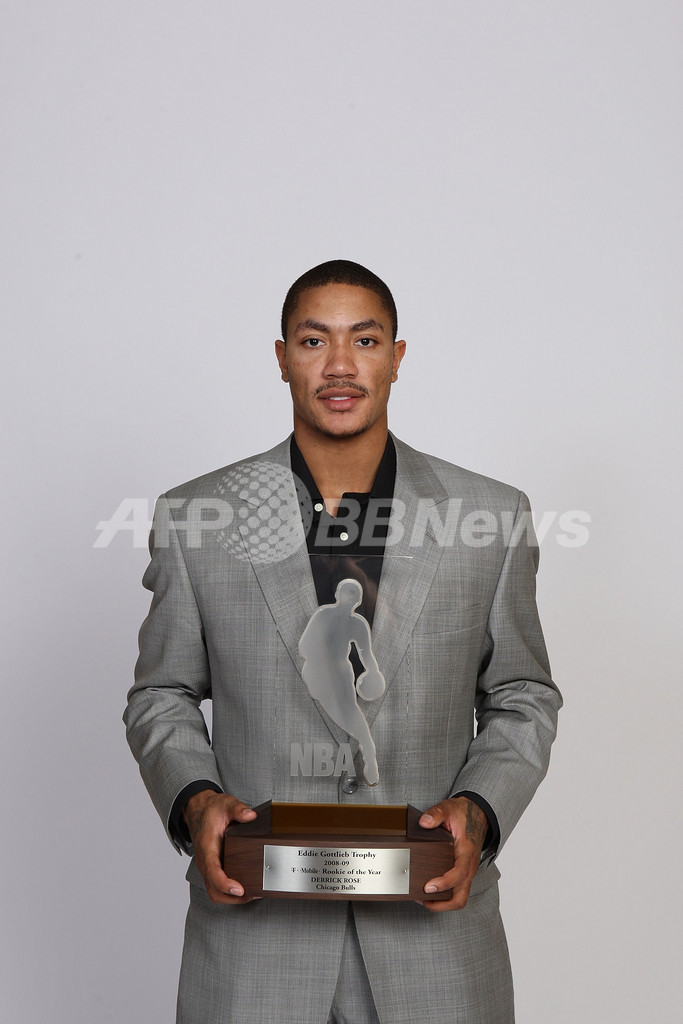 1984-85シーズンのマイケル・ジョーダン(Michael Jordan)氏、1999-2000シーズンのエルトン・ブランド(Elton Brand)に続き、ローズはブルズから新人王に選出された3人目の選手となった。(c)AFP