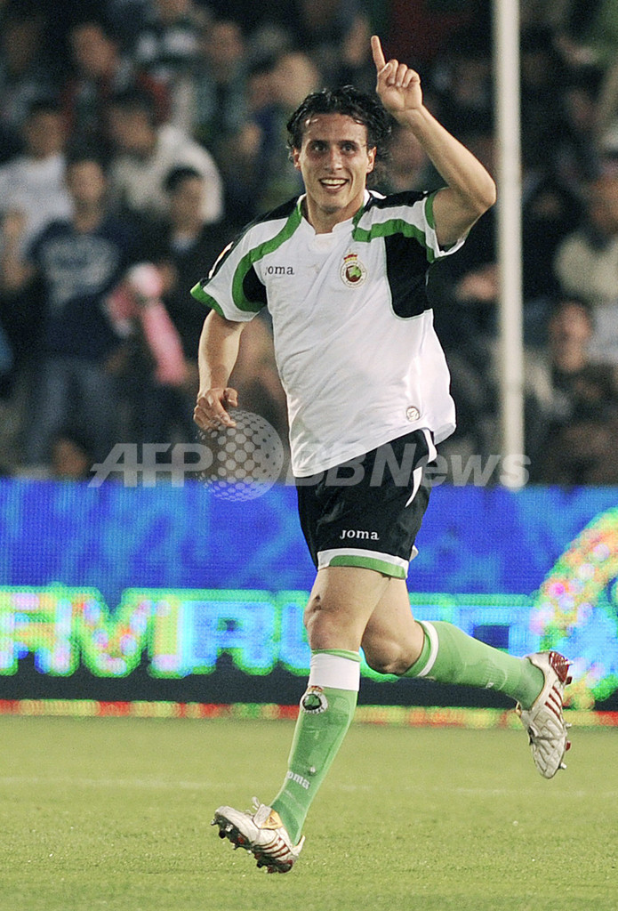 08-09スペイン1部リーグ・第32節、ラシン・サンタンデール(%%Racing Santander%%)対アトレティコ・マドリード(%%Atletico de Madrid%%)。試合はラシン・サンタンデールが5-1で圧勝した。写真は前半9分に先制点を挙げて歓喜するラシンのクリスティアン・フェルナンデス(%%Christian Fernandez Salas%%)。(2009年4月23日撮影)(c)AFP/Rafa Rivas