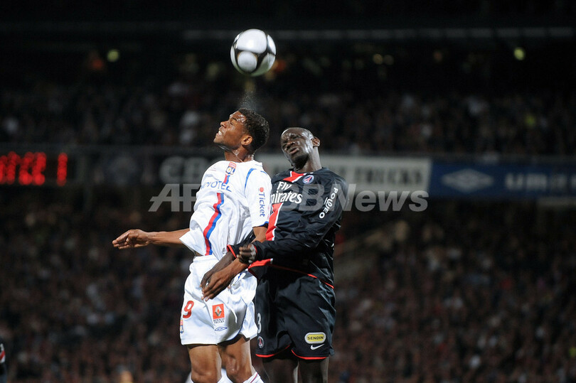 08-09フランスリーグ1第33節、オリンピック・リヨン(%%Olympique Lyon%%)対パリ・サンジェルマン(%%Paris Saint-Germain%%)。試合は0-0のスコアレスドローに終わり、リーグ8連覇を目指すリヨンにとって厳しい結果となった。写真はハイボールを競るオリンピック・リヨンのフレデリク・ピキオン(%%Frederic Piquionne%%)とパリ・サンジェルマンのママドゥ・サコ(%%Mamadou Sakho%%)。(2009年4月24日撮影)(c)AFP/PHILIPPE MERLE