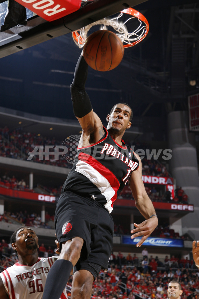 08-09NBA西カンファレンスプレーオフ1回戦、ヒューストン・ロケッツ(%%Houston Rockets%%)対ポートランド・トレイルブレイザーズ(%%Portland Trail Blazers%%)第3戦。試合はロケッツが86-83で勝利し、対戦成績を2勝1敗とした。写真はダンクシュートを決めるトレイルブレイザーズのラマーカス・アルドリッジ(%%LaMarcus Aldridge%%)。(2009年4月24日撮影)(c)AFP/Getty Images/NBAE/Bill Baptist