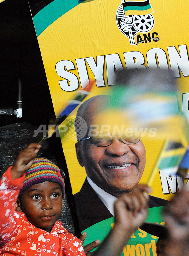 【4月25日 AFP】南アフリカの総選挙で、選挙管理員会が24日に出した非公式発表によると、与党アフリカ民族会議(African National Congress、ANC)が全有権者2300万人のうち1160万人の得票で絶対多数を獲得した。総選挙の大勝を受けて大統領に選出される見込みとなったANCのジェイコブ・ズマ(Jacob Zuma)議長は、激動する経済状況の中、貧困層からの大きな期待を背負うことになる。(c)AFP/Fran Blandy