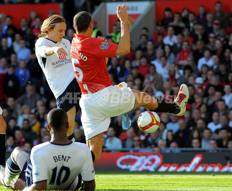 前半に2点を先制されたマンチェスター・ユナイテッドは、カルロス・テベス(Carlos Tevez)を投入して後半に入ると、クリスティアーノ・ロナウド(Cristiano Ronaldo)とウェイン・ルーニー(Wayne Rooney)がそれぞれ2得点を挙げて15分間で4得点を記録し、最後はディミタール・ベルバトフ(Dimitar Berbatov)の得点で突き放した。(c)AFP/Ian Whittell