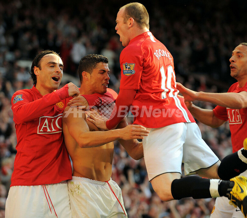 前半に2点を先制されたマンチェスター・ユナイテッドは、カルロス・テベス(Carlos Tevez)を投入して後半に入ると、クリスティアーノ・ロナウド(Cristiano Ronaldo)とウェイン・ルーニー(Wayne Rooney)がそれぞれ2得点を挙げて15分間で4得点を記録し、最後はディミタール・ベルバトフ(Dimitar Berbatov)の得点で突き放した。(c)AFP/Ian Whittell