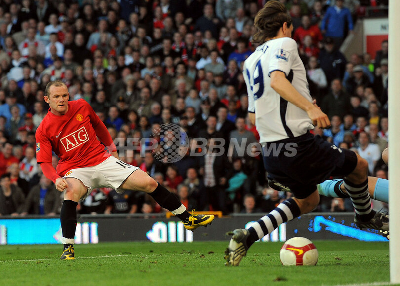 前半に2点を先制されたマンチェスター・ユナイテッドは、カルロス・テベス(Carlos Tevez)を投入して後半に入ると、クリスティアーノ・ロナウド(Cristiano Ronaldo)とウェイン・ルーニー(Wayne Rooney)がそれぞれ2得点を挙げて15分間で4得点を記録し、最後はディミタール・ベルバトフ(Dimitar Berbatov)の得点で突き放した。(c)AFP/Ian Whittell
