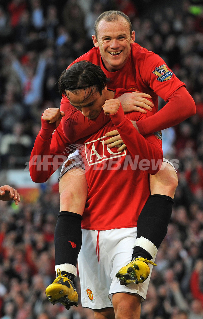 前半に2点を先制されたマンチェスター・ユナイテッドは、カルロス・テベス(Carlos Tevez)を投入して後半に入ると、クリスティアーノ・ロナウド(Cristiano Ronaldo)とウェイン・ルーニー(Wayne Rooney)がそれぞれ2得点を挙げて15分間で4得点を記録し、最後はディミタール・ベルバトフ(Dimitar Berbatov)の得点で突き放した。(c)AFP/Ian Whittell