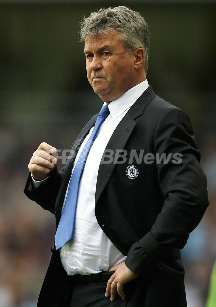 08-09イングランド・プレミアリーグ、ウェストハム(%%West Ham%%)対チェルシー(%%Chelsea%%)。試合はチェルシーが1-0でウェストハムを下し、28日に控えるFCバルセロナ(%%FC Barcelona%%)との欧州チャンピオンズリーグ2008-09(%%UEFA Champions League 2008-09%%)準決勝へ弾みをつけた。写真は戦況を見守るチェルシーのフース・ヒディンク(%%Guus Hiddink%%)監督。(2009年4月25日撮影)(c)AFP/Glyn Kirk