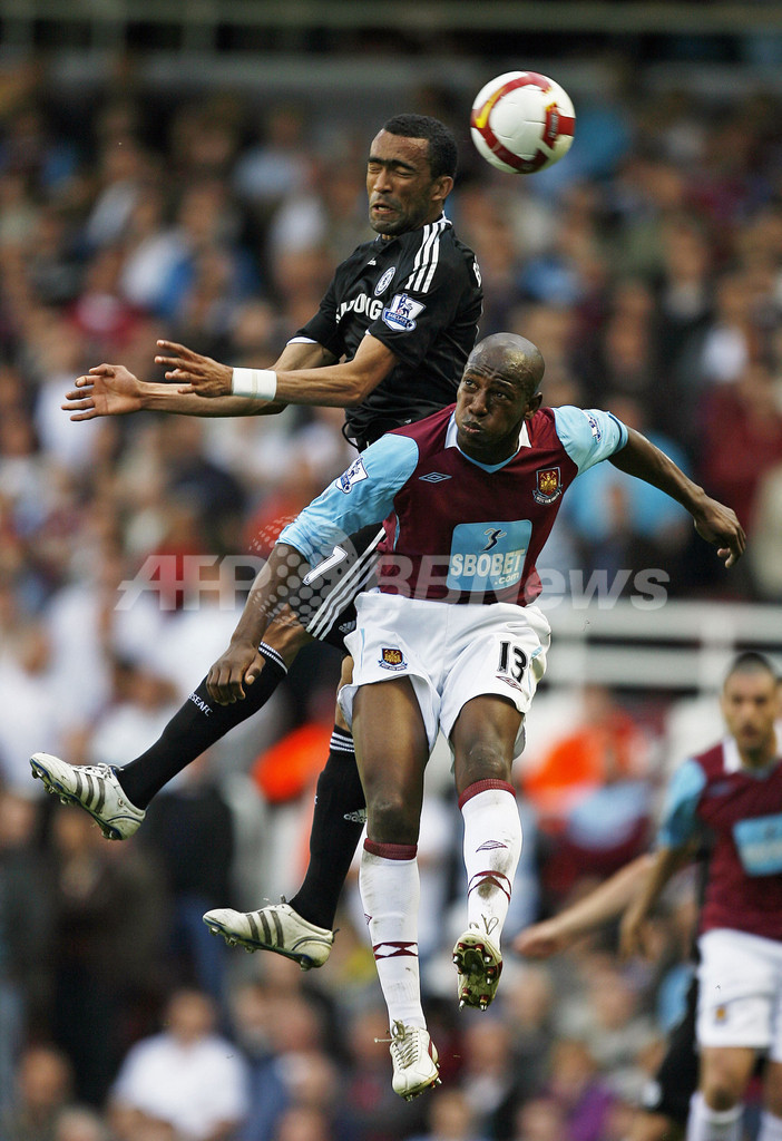 08-09イングランド・プレミアリーグ、ウェストハム(%%West Ham%%)対チェルシー(%%Chelsea%%)。試合はチェルシーが1-0でウェストハムを下し、28日に控えるFCバルセロナ(%%FC Barcelona%%)との欧州チャンピオンズリーグ2008-09(%%UEFA Champions League 2008-09%%)準決勝へ弾みをつけた。写真はハイボールを競るチェルシーのジョゼ・ボジングワ(%%Jose Bosingwa%%)とウェストハムのルイス・ボア・モルテ(%%Luis Boa Morte%%、右)。(2009年4月25日撮影)(c)AFP/Glyn Kirk