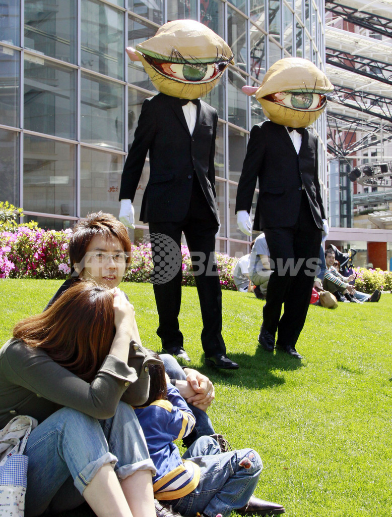 写真は、六本木ヒルズを練り歩くパフォーマンス・グループ「Medaman-Medaman」(2009年4月26日撮影)。(c)AFP/Yoshikazu TSUNO