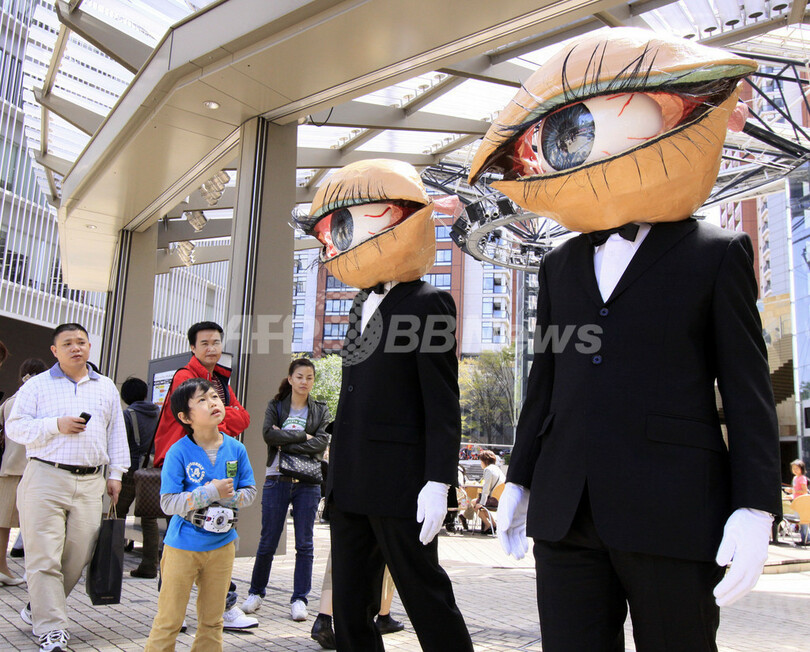 【4月26日 AFP】ゴールデンウイークが始まった都内の六本木ヒルズ(Roppongi Hills)で26日、大きな目玉のマスクを被ったパフォーマンス・グループ「Medaman-Medaman」などさまざまなストリートパフォーマーらが、訪れた買い物客らを楽しませた。(c)AFP
