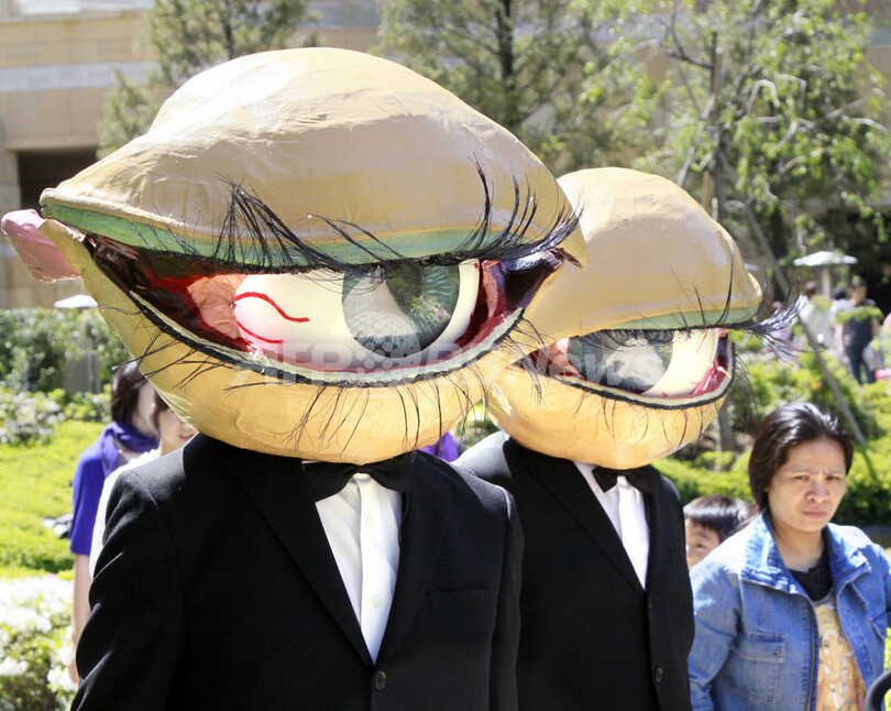 写真は、六本木ヒルズを練り歩くパフォーマンス・グループ「Medaman-Medaman」(2009年4月26日撮影)。(c)AFP/Yoshikazu TSUNO