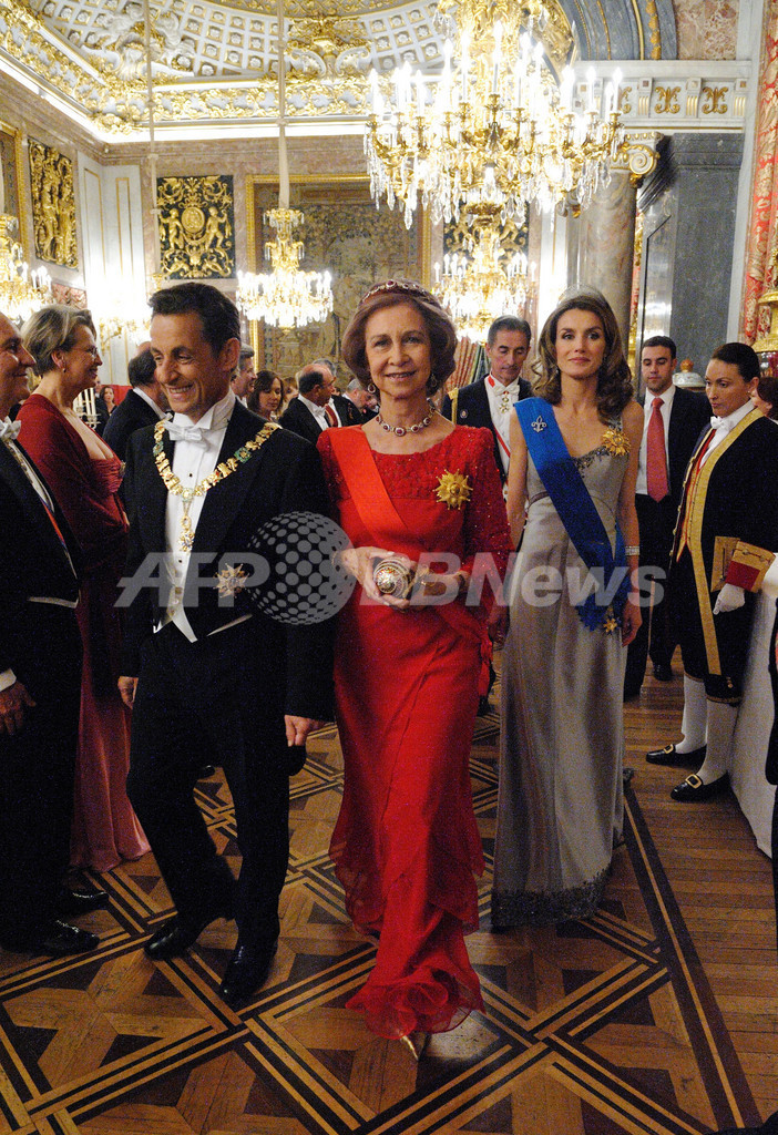 写真は、晩餐会に出席した、サルコジ大統領(左)、スペインのレティシア皇太子妃 (Princess Letizia、右)、ソフィア王妃(Queen Sofia、2009年4月27日撮影)。(c)AFP/ERIC FEFERBERG
