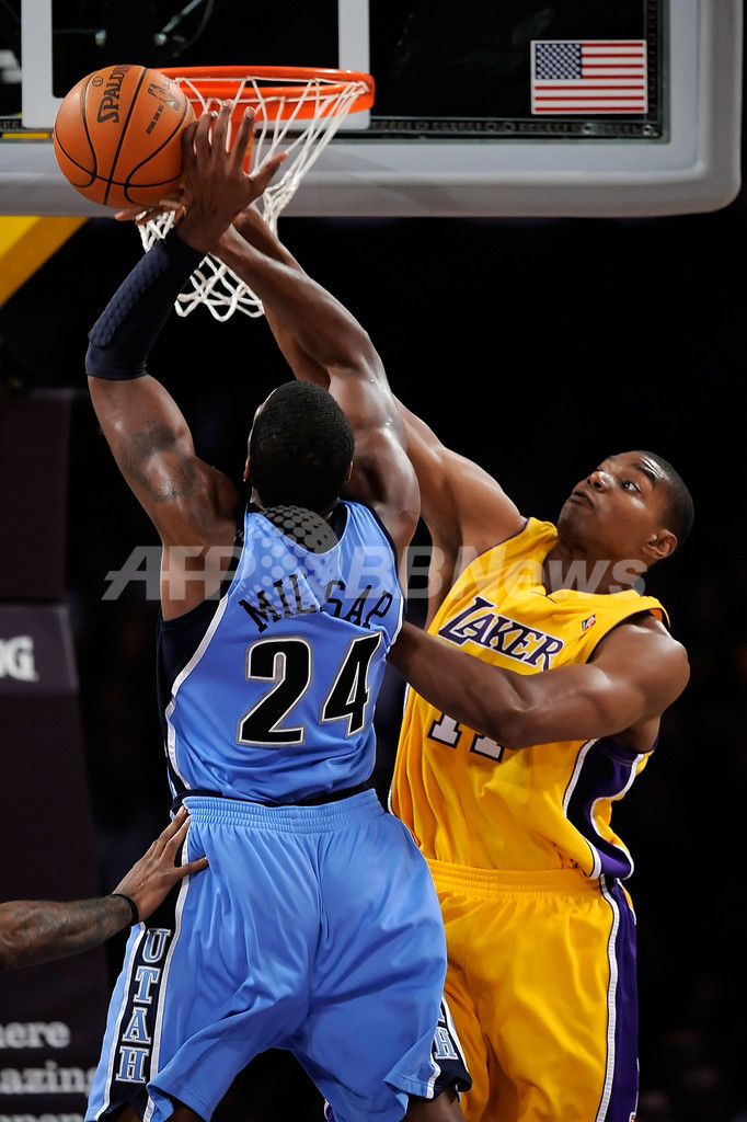 【4月28日 AFP】08-09NBA西カンファレンスプレーオフ1回戦、ロサンゼルス・レイカーズ(Los Angeles Lakers)対ユタ・ジャズ(Utah Jazz)第5戦。試合はレイカーズが107-96で勝利し、通算戦績を4勝1敗として同準決勝に進んだ。