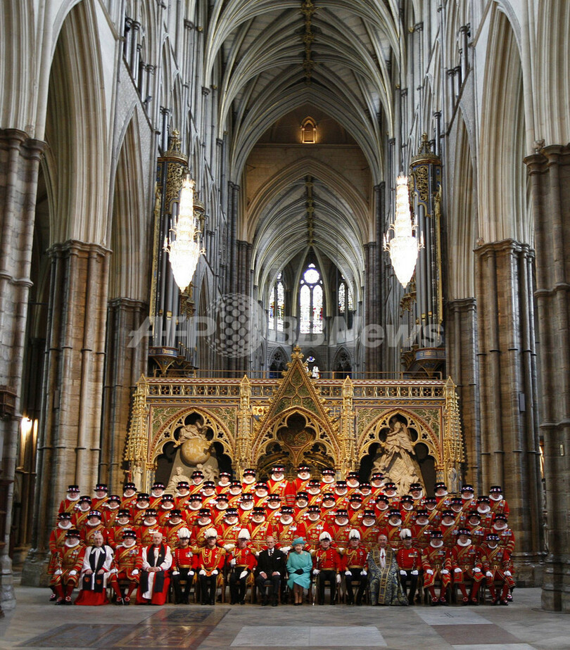 赤い制服で有名な英国君主の近衛兵、ヨーマン・オブ・ザ・ガード(Queen's Body Guard of the Yeoman of the Guard)の創設者ヘンリー7世(Henry VII)の没後500年の記念行事が28日、ロンドン(London)のウエストミスター寺院(Westminster Abbey)で行われ、エリザベス女王(Queen Elizabeth II、最前列中央右)とエディンバラ公(Duke of Edinburgh)フィリップ殿下(Prince Philip、同左)が、ずらりと並んだ近衛兵らと記念撮影を行った(2009年4月28日撮影)。(c)AFP/WPA/Stephen Hird