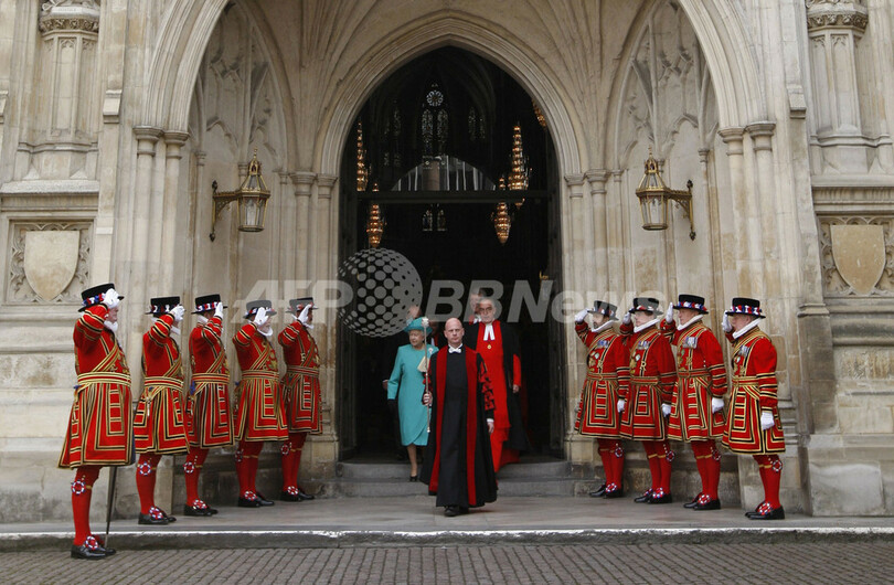 赤い制服で有名な英国君主の近衛兵、ヨーマン・オブ・ザ・ガード(Queen's Body Guard of the Yeoman of the Guard)の創設者ヘンリー7世(Henry VII)の没後500年の記念行事が28日、ロンドン(London)のウエストミスター寺院(Westminster Abbey)で行われ、エリザベス女王(Queen Elizabeth II)とエディンバラ公(Duke of Edinburgh)フィリップ殿下(Prince Philip)が出席した。写真は、ウェストミンスター寺院を出るエリザベス女王に敬礼するヨーマン・オブ・ザ・ガード(中央左、2009年4月28日撮影)。(c)AFP/WPA/Stephen Hird