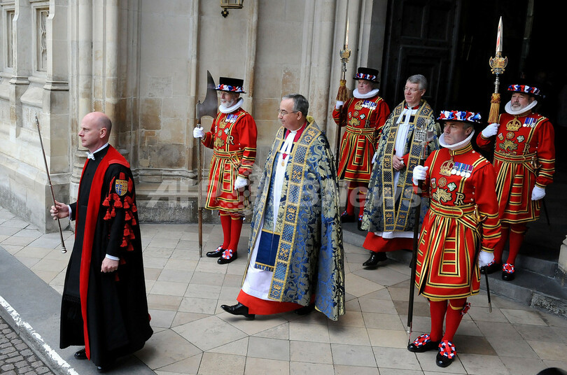 赤い制服で有名な英国君主の近衛兵、ヨーマン・オブ・ザ・ガード(Queen's Body Guard of the Yeoman of the Guard)の創設者ヘンリー7世(Henry VII)の没後500年の記念行事が28日、ロンドン(London)のウエストミスター寺院(Westminster Abbey)で行われ、エリザベス女王(Queen Elizabeth II)とエディンバラ公(Duke of Edinburgh)フィリップ殿下(Prince Philip)が出席した。写真は、ウェストミンスター寺院を出る主任司祭(中央)と副司祭(同右、2009年4月28日撮影)。(c)AFP/Carl de Souza