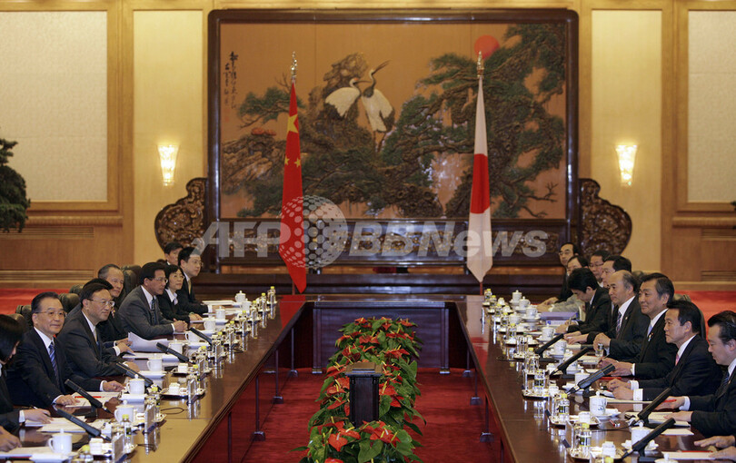 一方、麻生首相の今回の訪中では、両国間の長年にわたる懸案事項にも注目が集まった。麻生首相は前週、靖国神社に真榊料を奉納したが、国営新華社(Xinhua)通信によると、温首相は「歴史問題は敏感な問題で、国民感情にかかわるものだ。日本側が適切に処理することを望む」と述べ、不快感を示した。(c)AFP/Kyoko Hasegawa