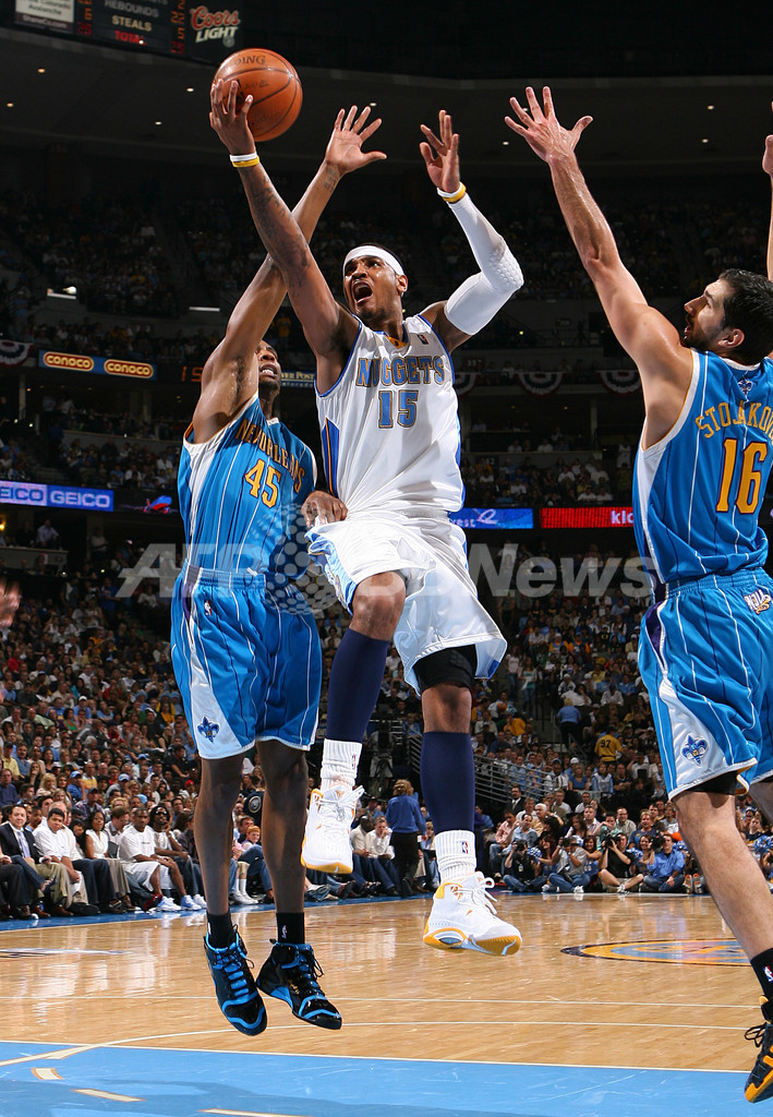 08-09NBA西カンファレンスプレーオフ1回戦、デンバー・ナゲッツ(%%Denver Nuggets%%)対ニューオーリンズ・ホーネッツ(%%New Orleans Hornets%%)第5戦。試合はナゲッツが107-86で勝利し、対戦戦績を4勝1敗として15年ぶりのカンファレンス準決勝進出を決めた。ナゲッツは準決勝でダラス・マーベリックス(%%Dallas Mavericks%%)と対戦する。写真はラシュアル・バトラー(%%Rasual Butler%%、左)の前でシュートを放つナゲッツのカーメロ・アンソニー(%%Carmelo Anthony%%、中央)。(2009年4月29日撮影)(c)AFP/Getty Images/NBAE/Garrett W. Ellwood