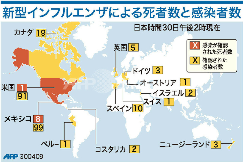 ニュース ライフ 図解 【図解】新型インフルエンザによる死者数と感染者数 2009年4月30日 16:47 発信地:その他 [ 例外 その他 ] このニュースをシェア (c)AFP 【4月30日 AFP】図は、日本時間30日午後2時現在の、各国の新型インフルエンザによる死者数と感染者数の状況を示したもの。(c)AFP<ニュース解説画像一覧へ>【参考】厚生労働省のホームページ ライフ 一覧へ> メディア・報道関係・法人の方向け 写真・動画 購入のお問合せ>